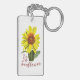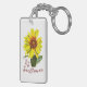 Radiate good vibes displaying this yellow sunflower keychain. Modify the background color to match your current style. Add or remove the text to personalize.