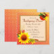 Elegant harvest invitation with sunflowers, wheat, acorns, leaves, mushrooms, berries, and a bird. Set in a white polkadot on orange background.