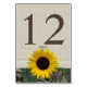 Yellow Sunflower and burlap with nature's own camouflage of tree bark and leaves, printed design table number card to compliment our woodland sunflower invitation set, can be personalised and ordered individually. All parts of this card are printed. There are no burlap or flower attached.
