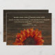 A wedding invitation featuring an image of an orange sunflower peeking from bottom over a background of dark brown barnwood. Personalise the text with details of your occasion.