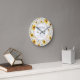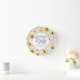 "Sunflower Bee Rustic Wood Yellow Birth Stats Baby Round Clock." A fun way to celebrate your new little one with your baby's birth stats: full name, date, time of birth, weight and length are easily customised using the template fields. Rustic white cottage wood with sunflowers, eucalyptus leaf greenery, dried foliage and bumble bees were originally hand painted by internationally licensed artist and designer, Audrey Jeanne Roberts. Copyright.