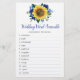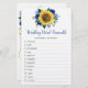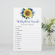 This bridal shower game is a wedding word scramble with 12 words to unscramble. It features a watercolor sunflower and blue floral design with faux gold foil geometric frame on the back. Personalise the text on the back with the bride's name.