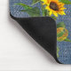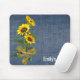 Yellow sunflower bouquet tied with floral ribbon on blue denim background.