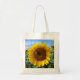 Close up of a sunflower taken against a backdrop of a field of sunflowers