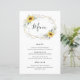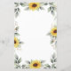 Design features watercolor greenery, sunflowers, printed gold elements and airy botanical leaves over a printed gold coloured geometric frame. The back features a matching greenery and sunflower wreath.