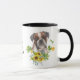 "LOVE MY BOXER" declares this mug for the proud Boxer dog owner. Each side of the mug has a beautiful watercolor portrait of a brown and white Boxer dog framed by sunflower blossoms and green leaves. Mixed in are sprigs of blue green eucalyptus. Between the two images is the text, which may be easily customised, or even removed, by you.