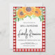 Invite your family to their gathering with this floral family reunion invitation which is decorated with watercolor sunflowers and foliage on a red gingham background.