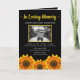 In Loving Memory program featuring on the front cover a photo of your loved one, their name, dates, the memoral venue, date of the event in white text on a black background with three yellow sunflowers. On the inside is an obituary and order of service; and on the back a thank you note and the venue of the wake.