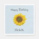 Custom floral Happy Birthday party napkin with a yellow sunflower on a pale blue background. Black lettering can be customised with your own message. A lovely addition to that special someone's birthday celebration!