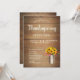 Rustic thanksgiving invitation on an old wooden wall, featuring a watercolor milk bucket filled with seasonal flowers, vibrant sunflowers, red and green leaves and bright orange pumpkins.