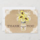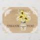 Sunflower bouquet in mason jar and white lace on kraft-look paper background modern rustic floral thank you card.