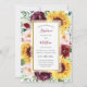 These wedding invitations feature a watercolor floral design with sunflowers, burgundy blush flowers and foliage with a faux gold frame. The back is a burgundy colour with a matching sunflower and burgundy blush floral motif. Personalise these invitations with your text. Matching wedding suite items are also available. Please visit our store.