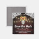 Sunflower Mason Jar Wood Save the Date Magnets - feature a deep red barn wood background trimmed with lace and decorated with warm coloured string twinkle lights. The design also features a bouquet of sunflowers inside a mason jar that you can customise the initials to those of your choice.