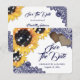Elegant navy blue and sunflower wedding save the date card featuring sunflower flowers, string lights, burlap hearts and delicate floral lace. Our floral wedding save the date card is perfect for a navy blue rustic country, backyard, or barn wedding party inspired by sunflowers.