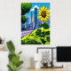 A yellow sunflower in a park with a large city in the background with blue sky and white cloud. This is a AI generated art.