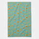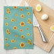 Kitchen towel with sunflowers. Yellow flowers and sage green stems make a sunny pattern on turquoise blue coloured towels.