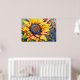 Vibrant watercolor painting of a close up of a sunflower in bright colours.