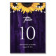 Rustic purple and sunflower wedding table number card featuring sunflower flowers and string lights against a rustic wood background. Matching items available.