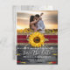 Are you planning for a rustic wedding and wish to include beautiful sunflowers/daisies in your invitations and engagement announcement cards? Here are gorgeous watercolor sunflower save the date postcards that you can insert your own photo and send out to your guests! The floral design features an original illustration by Raphaela Wilson of a large gold yellow sunflower over a burlap and burgundy red lace ribbon. Sparkling string lights and petals lie over a vintage country barn wood for a subtle romantic flare, and a sunflower rose bouquet mason jar can be seen on the back. Thinking of a different wood tone? The rustic sunflower save the date invitations have many creative options. Simply customise the design further and uncover layers of different wood finishes. You can even change your lace ribbon colour to navy blue, teal green, white, and more! The typography seen displays a white elegant brush script calligraphy font, but these styles may be altered as well. Category: spring flowers western summer wedding photo template save the date invitations; stylish save the date invitations; and spring country rustic save the date invitations. Autumn/fall wedding colour palette theme: burgundy, red, maroon, yellow gold, grey and white.