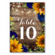 Sunflower & Roses Rustic Wedding Table Numbers. Featuring yellow sunflowers and navy roses over a rustic wood plank background.