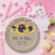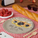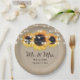 Personalised rustic burlap and sunflower wedding paper plates featuring sunflower flowers and string lights on a burlap background. Matching items available to complement these rustic floral wedding paper plates. Easily personalise to any occasion.