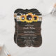 Rustic sunflower wedding invitation featuring sunflowers and string lights against a rustic wood background adorned with burlap and lace ribbon. Two burlap hearts at the back. Easily personalise this rustic country floral wedding card with your wedding details.