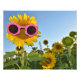 Pink polka dot sunglasses on sunflower in a field of sunflowers.