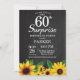 Sunflower Surprise 60th Birthday Invitation. Floral Flowers and Chalkboard Background. Country Vintage Retro. Women Birthday. 12th 13th 15th 16th 18th 20th 21st 30th 40th 50th 60th 70th 80th 90th 100th, any ages. Printable Digital. For further customisation, please click the "Customise it" button and use our design tool to modify this template.