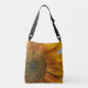 A sign of summer. A fully bloomed sunflower adorns this handy tote bag. Use it hands free. Frees up your hands to hold your camera or an ice cream.