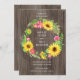 Sunflower wedding invitation with yellow and hints of pink flowers and green leaves in a round wreath on a wood background. The couples' names are inside the floral frame. The back of the invitation is decorated with the same wood background.