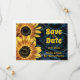 Sunflower yellow rustic country retro denim blue jeans wedding save the date announcement flat card. Beautiful floral design. Image copyright Marg Seregelyi Photography.