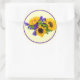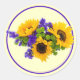 Round sticker with an image of three bright yellow sunflowers and blue seas statice on soft yellow with a purple border. This variety of statice produces large clusters of deep blue flowers over a long season, perfect for using in both dried and fresh flower arrangements. The sunflower (Helianthus annuus) is an annual plant native to the Americas. It possesses a large inflorescence (flowering head), and its name is derived from the flower's shape and image, which is often used to depict the sun. See matching confetti and wrapping paper. See the entire Flowers & Plants Sticker collection in the CARDS, POSTCARDS & STICKERS section.
