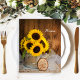 Customize the charming Sunflowers and Garden Watering Can Wedding Menu with the details of the meal that you will serve at your summer or fall farm or ranch style bridal shower, post wedding brunch or marriage reception dinner by adding the salad or first course, entree or second course and dessert or third course. This country chic custom rustic nuptial menu features a digitally enhanced floral photograph of a metal watering can filled with yellow sunflower blossoms, white bridal veil, natural wood slice with the word LOVE burned on it and a vintage lace trimmed linen handkerchief with a burlap and weathered barn wood background. Perfect for your casual barn party celebration event.