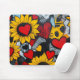 This vibrant mural features a colourful mix of sunflowers and hearts. The sunflowers are depicted with bright yellow petals and red centres, while the hearts are scattered throughout the artwork in various shades of red. The background is a mix of abstract geometric patterns and textures, creating a dynamic and eye-catching contrast. The overall theme suggests love and positivity, with the sunflowers symbolising happiness and the hearts representing affection.