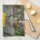 Announce your upcoming nuptials in a unique and unusual way with the pretty Rustic Sunflowers and Wagon Wheel Country Western Wedding Save the Date Kitchen Towel. This casual yet classy custom botanical marriage keep the date towel features a digitally painted floral photograph of a bouquet of yellow sunflower blossoms with an old wagon wheel and wooden fence post. Perfect inspo for an informal farm style barn party marriage ceremony and reception event.