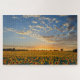"Sunflowers at Sunset" Jigsaw Puzzle by Catherine Sherman. Thousands of sunflowers glow at sunset in a Kansas field. The sunflower (Helianthus annuus) is an annual plant native to the Americas, but it now grown around the world. The sunflower is the state flower of Kansas. It’s easy to see how the sunflower got its name with its petals that look like the rays of the sun. It also grows towards the sun. Sunflowers were domesticated around 1000 B.C. Francisco Pizarro found the Incan people venerating the sunflower as an image of their sun god. Gold images of the flower, as well as seeds, were taken back to Europe early in the 16th century. The plant has a rough, hairy stem and large coarsely toothed, rough leaves, and circular flower heads. The heads consist of many individual flowers which mature into seeds, often in the hundreds, on a receptacle base. All parts of the sunflower are useful as either food or fibre.
