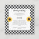 Rustic boho sunflowers on a black-edged white panel above a diagonal black and white buffalo check background in this cheerful summer into fall "Books for Baby" baby shower book request design. Composite design by Holiday Hearts Designs (rights reserved).