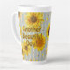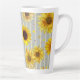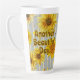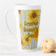 Tall latte mug with sunflowers over stripes design. Add some text, or use the sample, "Another beautiful day" wording. Colors are yellow flowers, brown text, and gray blue background stripes. This sunny and cheerful mug greets you each morning with an uplifting message to go along with the happy flowers. The wording will need to be removed, or moved if the smaller mug size is chosen.