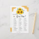 This bridal shower game card is What's in your purse? The design features watercolor floral design with sunflowers, eucalyptus leaves, honey bees and honeycomb. Personalise the back of the cards with the bride's name. Matching bridal shower party supplies also available.