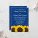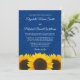 A country themed wedding invitation featuring yellow sunflowers on a dark blue damask background. Elegant sunflower wedding invitations, perfect for summer wedding or sunflower themed party.