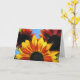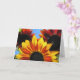 This note card is full of brightness and cheer! Three brilliantly coloured sunflowers are illuminated by the sunlight streaming through the petals. The flowers display a gorgeous palette of gold, yellow, orange, red and brown. Green leaves and blue sky complete this composition of colour and form.