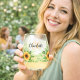 Decorated with sunflowers and eucalyptus greenery. Personalise and add your first name and monogram initials. Black and golden text.