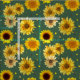 Sunflowers fabric with repeating pattern. Yellow flowers are interspersed with little dots of color, over a dark gray-green background color.
