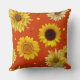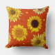 Orange throw pillow with sunflowers design. Big yellow flowers and little dots of yellow and brown cover this square, couch pillow.