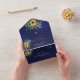A navy blue background decorated with watercolored sunflowers, eucalyptus greenery. The blue colour is uneven. Personalise and add your names, monogram and wedding details.