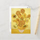 A postcard featuring the post-impressionist painting, Vase of Fifteen Sunflowers (1888) by the Dutch artist Vincent Van Gogh (1853-1890). This artwork depicts a vase of yellow flowers set against a golden background. Van Gogh created numerous versions of sunflower paintings.