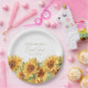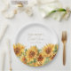 Vibrant yellow sunflower floral blooms bouquet border with greenery foliage making elegant boho chic spring summer fall garden bridal shower personalised paper plates with whimsical elegant modern hand lettered calligraphy script over a white background.
