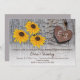 Sunflowers, metallic rusted heart with monogram on wood rustic engagement party wedding invitation featuring a brown rusted metallic heart with initials nailed on weathered grey barn wood board and three yellow sunflowers. This monogrammed floral wedding template design is fully customisable and is part of a wedding set or collection perfect for a summer or fall country barn wedding.