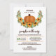 Beautiful pumpkin themed baby shower invitation for a gender neutral baby shower featuring an orange pumpkin with a half wreath of sunflowers, pretty flowers in yellow and mint, and berry twigs with orange berries for that perfect autumn look. Invite your friends and relatives to your autumn baby shower with a pumpkin theme with this charming pumpkin baby shower invitation with an orange gingham pattern printed on the back! A rustic yet sweet pumpkin gender neutral baby shower invitation for fall with sunflowers, an orange pumpkin and berry sprigs.