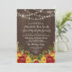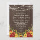 Rustic wedding invitation with pale yellow text against a printed wood grain background, decorated with arrangements of sunflowers and deep red roses, wheat, berries, and green leaves, and rows of glowing string lights. The back features a warm yellow gingham pattern. This rustic invitation is perfect for late summer weddings, fall weddings, rustic weddings, barn weddings, and country weddings!